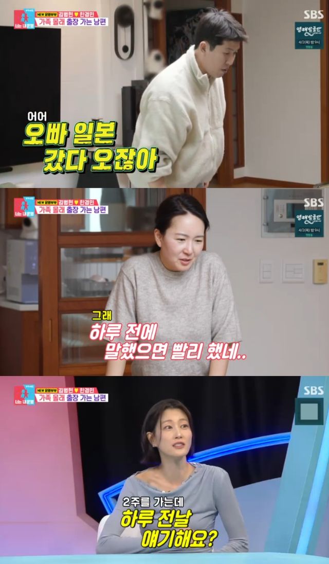 이날 김병현은 캐리어에 짐을 싸고 있었다. 아내 한경민은 "어디 가?"라고 궁금해했고, 김병현은 "내일 일본가잖아"라고 말했다.