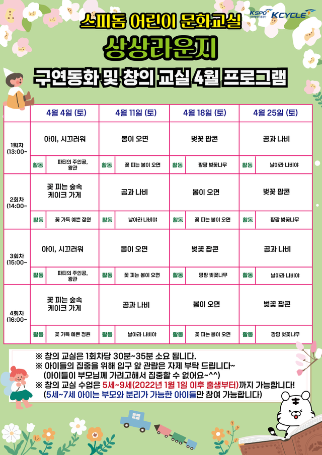 4월 프로그램은 봄의 분위기를 담은 동화와 체험 활동이 함께 진행되는 것이 특징이다. ‘아이, 시끄러워’, ‘봄이 오면’, ‘벚꽃 팝콘’, ‘곰과 나비’ 등 다양한 구연동화가 준비되어 있으며, 이야기와 연계한 만들기 체험도 함께 마련된다.
