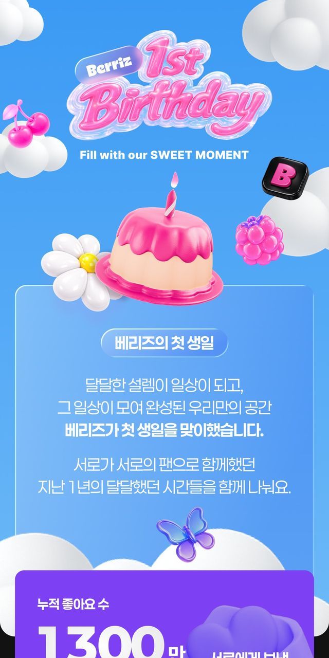 베리즈는 크기와 모양은 다르지만, 모일수록 더 크고 달콤해지는 베리들처럼 장르와 영역을 넘어 K컬처를 사랑하는 전 세계 팬덤이 함께 소통하며 즐거움을 더해가는 놀이공간으로 자리매김하겠다고 밝혔던 바 있다. 아이유(IU), 아이브(IVE), 아이들(i-dle) 등 다양한 K팝 아티스트들은 물론, ‘핑계고’, ‘우리들의 발라드’ 등 다양한 콘텐츠 IP들의 커뮤니티와 팬 스토어 등 차별화된 서비스로 IP의 즐거움을 확장하며 주목을 받고 있다. 베리즈에서 지난 1년간 진행한 라이브에 쏟아진 누적 응원수는 총 6000만 건, 평균 1초에 2번씩 전 세계 팬들의 응원이 이어진 셈이다. 글로벌 팬들이 참여한 누적 좋아요 수는 1300만 건, 누적 작성 포스팅 수는 200만 건을 기록하며 활발한 소통을 이어갔다.