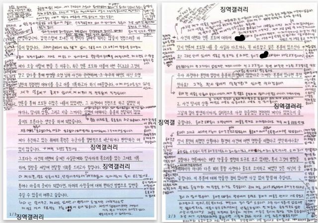 김소영과 김소영이 작성한 것으로 추정되는 옥중 편지 / 디시인사이드 '옥중 갤러리' 캡처