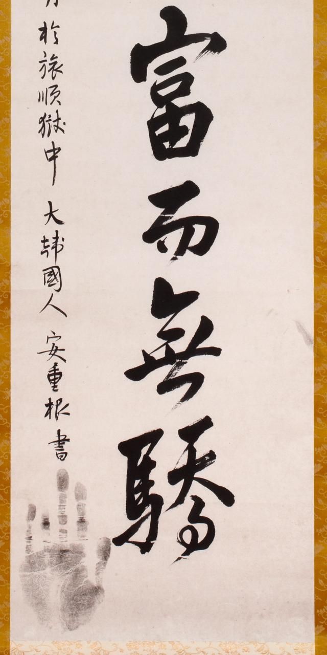 일본의 문호 도쿠토미 로카(1868~1927)가 1913년 뤼순 여행 중 입수한 후, 1918년 안중근 의사의 높은 인품에 대한 논평을 유묵 왼편 상단에 기재한 것으로, 안중근 의사가 뤼순 감옥에서 남긴 유묵 중 소장자의 논평이 기재 된 것은 이 유묵이 유일하다.