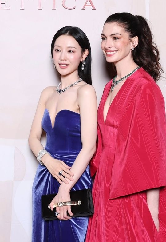 특히 할리우드 배우 앤 해서웨이와 나란히 선 모습이 눈길을 끌었다. 두 사람은 각기 다른 스타일의 드레스를 완벽하게 소화하며 글로벌 행사에 걸맞은 존재감을 발산했다.