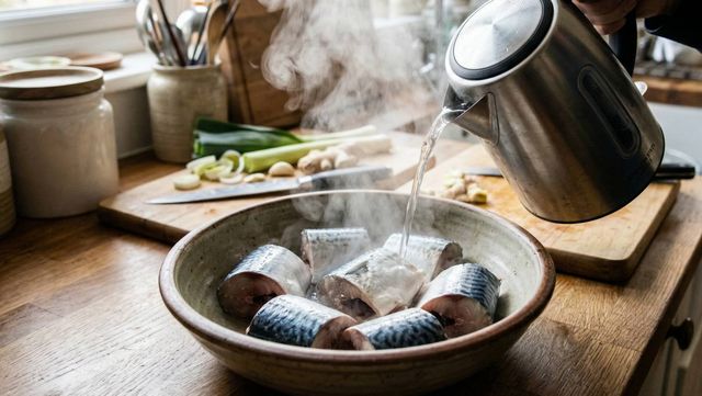 고등어에 뜨거운 물을 붓는 모습 (AI로 제작)