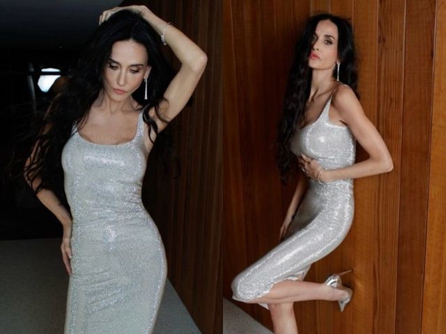 공개된 사진 속 데미 무어는 몸매 라인이 고스란히 드러나는 실버 슬립 드레스를 입고 벽에 기대거나 포즈를 취하며 치명적인 매력을 발산하고 있다.