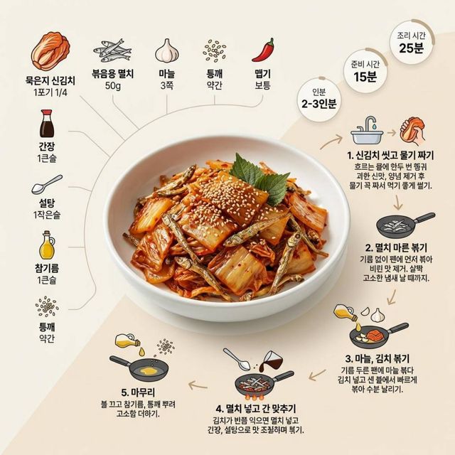 순서를 정리하자면, 신김치는 흐르는 물에 헹궈 물기를 꼭 짜고 먹기 좋은 크기로 썬다. 볶음용 멸치는 기름 없이 먼저 팬에 볶아 비린 맛을 없애둔다. 팬에 기름을 두르고 마늘을 볶다가 김치를 넣어 센 불에서 볶는다. 김치가 반쯤 익으면 멸치를 넣고 함께 볶은 뒤 간장으로 간을 맞춘다. 마지막에 참기름과 깨로 마무리하면 된다.