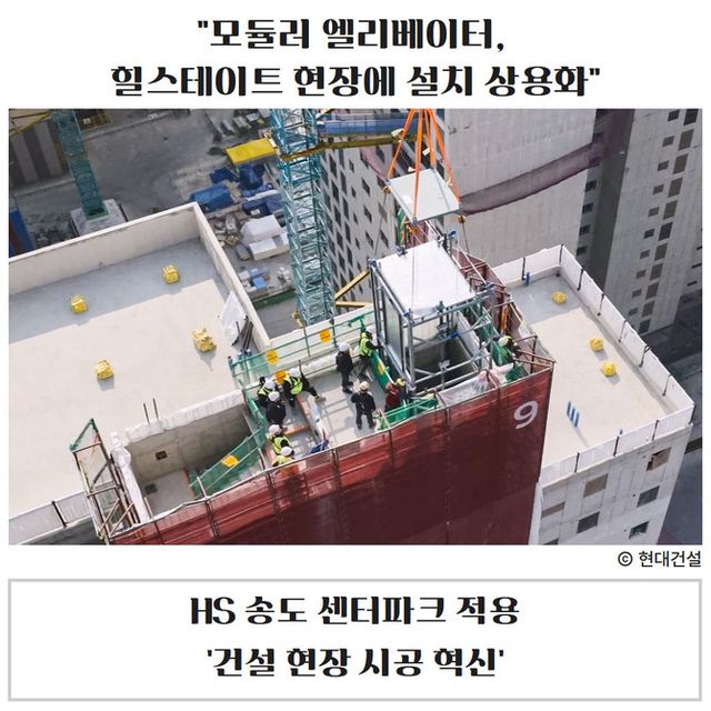 현대건설에 따르면, 인천 연수구 동춘동 '힐스테이트 송도 센터파크' 현장에 모듈러 엘리베이터 1기를 시공하고 기계실 설치와 시운전을 앞두고 있다. 모듈러 엘리베이터는 승강기 주요 구조물과 설비를 공장에서 사전 제작한 뒤 현장에서는 조립·설치만 진행하는 방식이다.