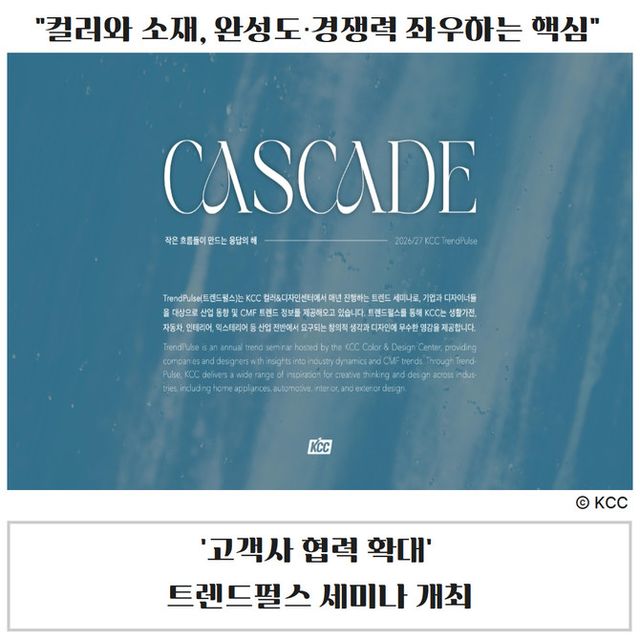 KCC가 2026/27 KCC 트렌드펄스(Trend-Pulse) 세미나를 통해 올해 디자인 키워드 'CASCADE'와 트렌드 컬러 'Cascade Blue'를 제시하며 고객사 소통을 이어가고 있다.
