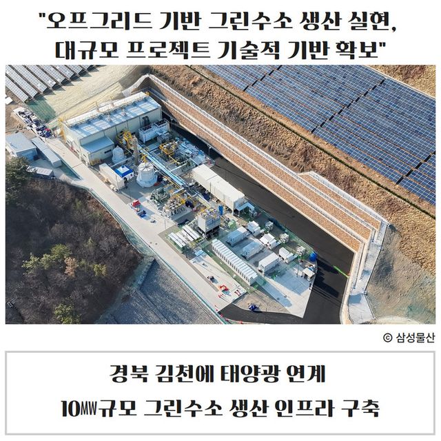 삼성물산(028260) 건설부문(이하 삼성물산)이 국내 최초 신재생에너지만을 활용한 오프그리드 기반 그린수소 생산시설을 준공했다. 경북 김천시에 구축된 이번 시설은 외부 전력망에 의존하지 않고 태양광 발전과 연계해 그린수소를 생산하는 방식으로, 국내 그린수소 생산 모델 첫 사례라는 점에서 의미가 있다.