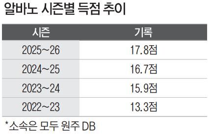 알바노는 올 시즌 경기당 평균 17.8점을 책임지고 있다. DB는 리그 득점 상위 30위권 내에 국내 선수가 한 명도 없어, 자칫 외국인 선수 헨리 엘런슨(20.8점)이 고립될 수 있다. 그러나 코트를 누비며 팀 공격을 조율하는 알바노 덕분에 이러한 부담이 분산되고 있다. DB에서 맞이한 네 번째 시즌, 알바노의 플레이는 한층 더 단단해졌다.