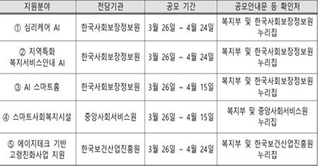 공모 기간은 심리케어 AI·지역특화 복지서비스 안내 AI·에이지테크 분야가 3월 26일~4월 24일, AI 스마트홈·스마트 사회복지시설 분야가 3월 26일~4월 15일까지다.