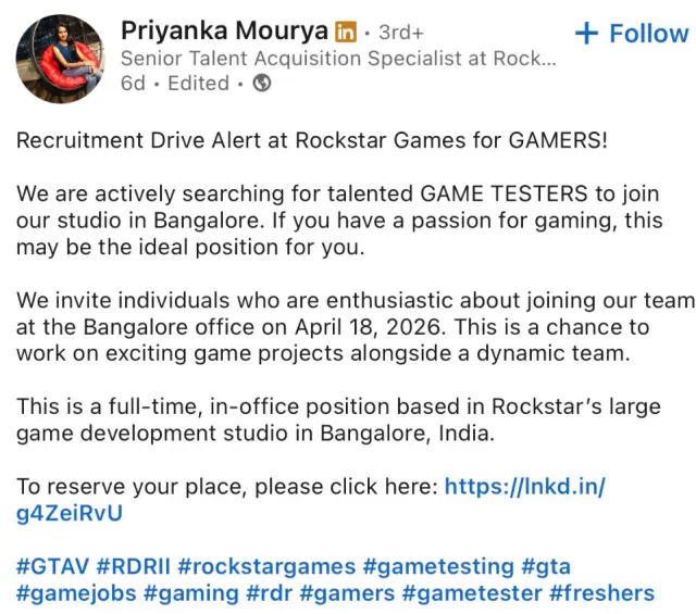 락스타 게임즈가 2026년 4월 18일 (오전 10시 ~ 오후 5시 30분) 방갈로르에서 대규모 게임 테스터 채용 행사를 개최합니다!