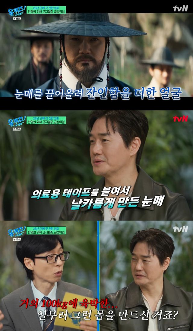 유재석은 한명회의 올라간 눈매에 대해 궁금해했고, 유지태는 "의료용 테이프를 불여서 눈을 살짝 올라가게 했다. 몸무게도 100kg까지 증량했다"고 말했다.