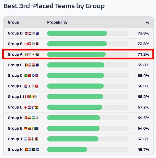축구통계매체 '풋볼미트데이터'는 25일(한국시간) 사회관계망서비스(SNS)를 통해 북중미 월드컵 조별리그 3위 팀이 토너먼트에 진출할 확률을 공개했다.