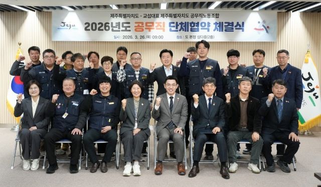 [파이낸셜경제=김영란 기자] 제주특별자치도와 교섭대표 노동조합인 제주도 공무직노동조합이 26일 도청 삼다홀에서 ‘2026년도 공무직 단체협약’을 체결했다.