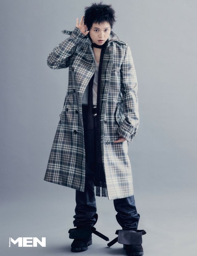 체크 트렌치 코트와 이너 톱,