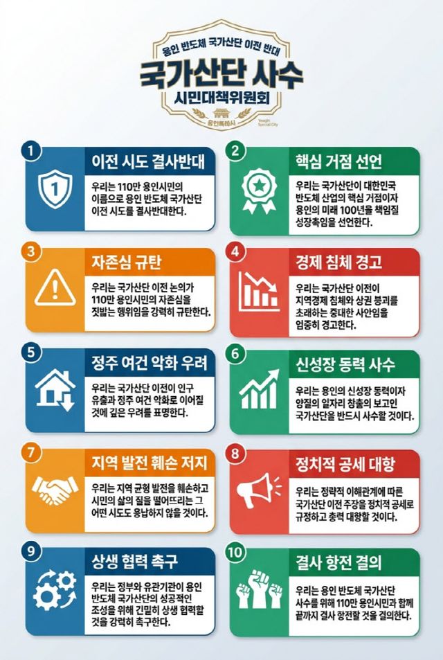 대책위 관계자는 “국가산단 문제는 이념이나 정치적 성향과 상관없는 110만 용인 시민 모두의 먹거리와 직결된 문제”라며 “정부와 정치권은 모호한 태도를 버리고 용인 원안 추진 방침을 분명히 천명해야 한다”고 촉구했다.