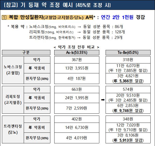 약가 인하로 만성질환자 등 환자 약값 부담이 줄어들 것으로 전망된다. 현재 노바스크정(고혈압약)을 처방 받는 고혈압환자의 한 해 본인부담 약값이 4만 187원인데, 약가 인하가 적용되면 연간 본인부담 약값이 3만 4821원으로 5366원 줄어든다.