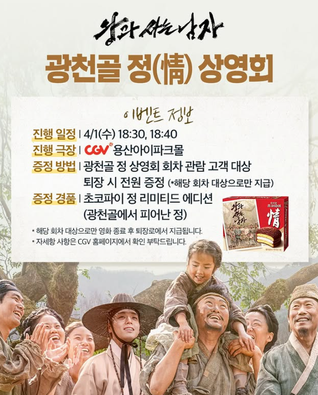 쇼박스 측은 “그동안 정이 너무 많이 들었소… ‘왕과 사는 남자’가 백성 여러분께 보답합니다!”라는 문구로 이벤트를 소개했다. 상영회에 참석한 관객 전원에게는 ‘광천골에서 피어난 정’ 콘셉트의 초코파이 ‘정’ 리미티드 에디션이 증정될 예정이다.