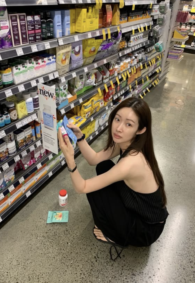 공개된 사진 속 차정원은 마트 진열대 앞에 쪼그려 앉아 제품을 살펴보고 있는 모습이다.