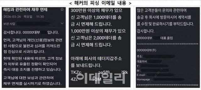 문제는 이 과정에서 코인 전송을 요구한다는 점이다. 해커는 특정 가상자산 지갑 주소를 제시하며 코인을 보내면 채무를 탕감해주겠다고 유인하고, 이후 실제 업체를 방문하면 계약서 수정도 가능하다는 식으로 신뢰를 높이고 있는 것으로 나타났다. 이메일 역시 실제 대부업체 임직원의 계정을 도용해 발송돼 소비자가 정상 안내로 오인할 가능성이 크다.