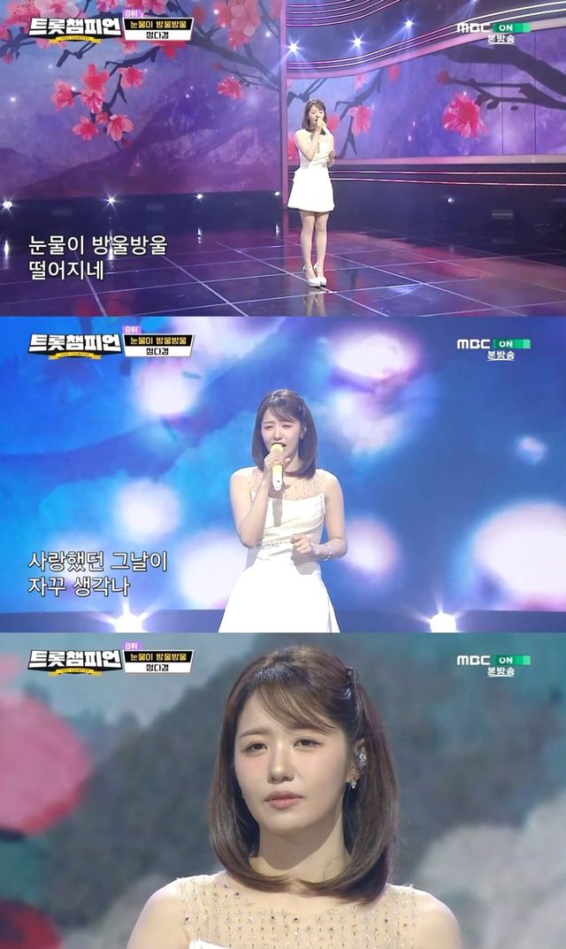정다경은 지난 26일 방송된 트롯챔피언에 출연해 ‘눈물이 방울방울’ 무대를 선보였다.