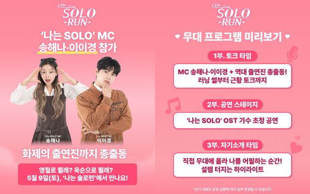 ‘2026 나는 솔로런’은 ENA, SBS Plus 공동제작 연애 리얼리티 ‘나는 솔로’ 세계관을 활용한 이색 러닝 이벤트다. 주최 측에 따르면 ‘나는 솔로’ MC 송해나와 이이경은 참가자들과 함께 10km 레이스에 직접 참여하며, 레이스 종료 후에는 두 사람이 함께 현장 무대 프로그램 진행에 나서 ‘나는 솔로’ 역대 출연진들과 소통할 예정이다.
