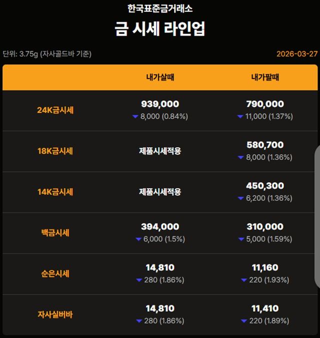 국내 금시세(금값)가 27일(이하 한국 시각) 오후 상승세(전 거래일 대비)를 상승세를 보이고 있다.