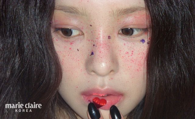 얼굴 위에 번지듯 스민 핏빛 기운을 은유적으로 표현한 주근깨 메이크업은