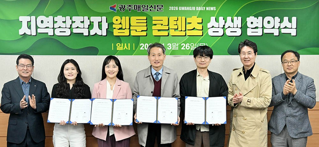 광주매일신문이 지역 웹툰 작가들과 ‘프리미엄 웹툰 연재’를 위한 협약을 체결하고 지역 창작 콘텐츠 발굴에 나선다. 이번 협약에는 국병석, 송재영, 정서현 등 지역 대표 작가들이 참여하며, 신진 작가들에게 안정적인 연재 기회를 제공하고 제작부터 유통까지 지원하는 체계를 구축할 계획이다.