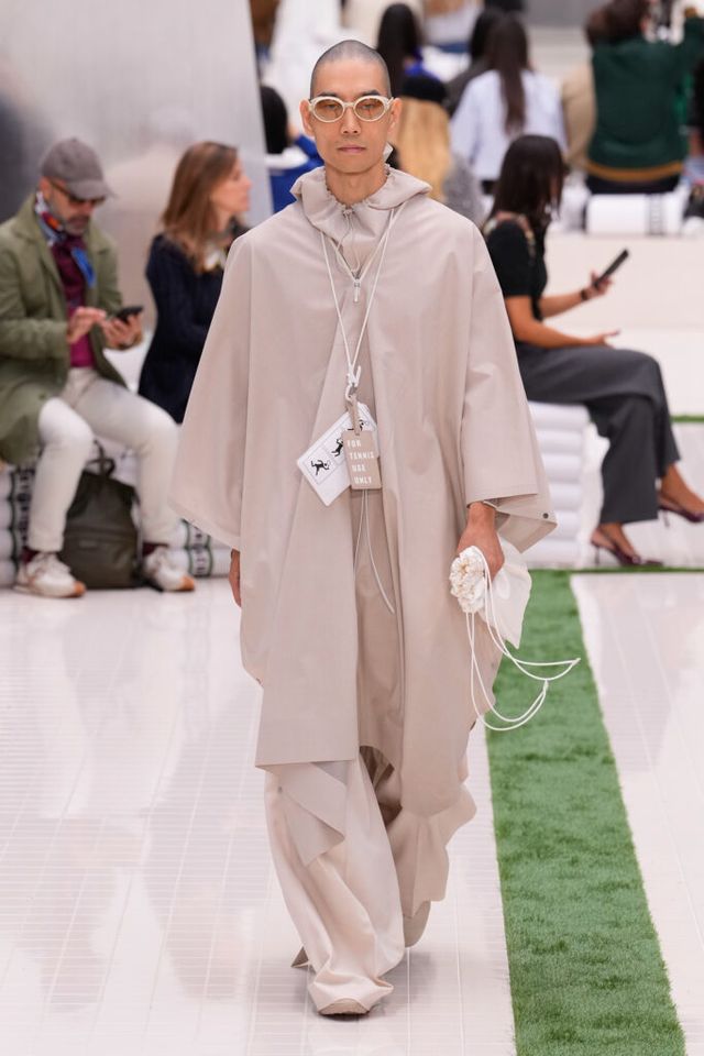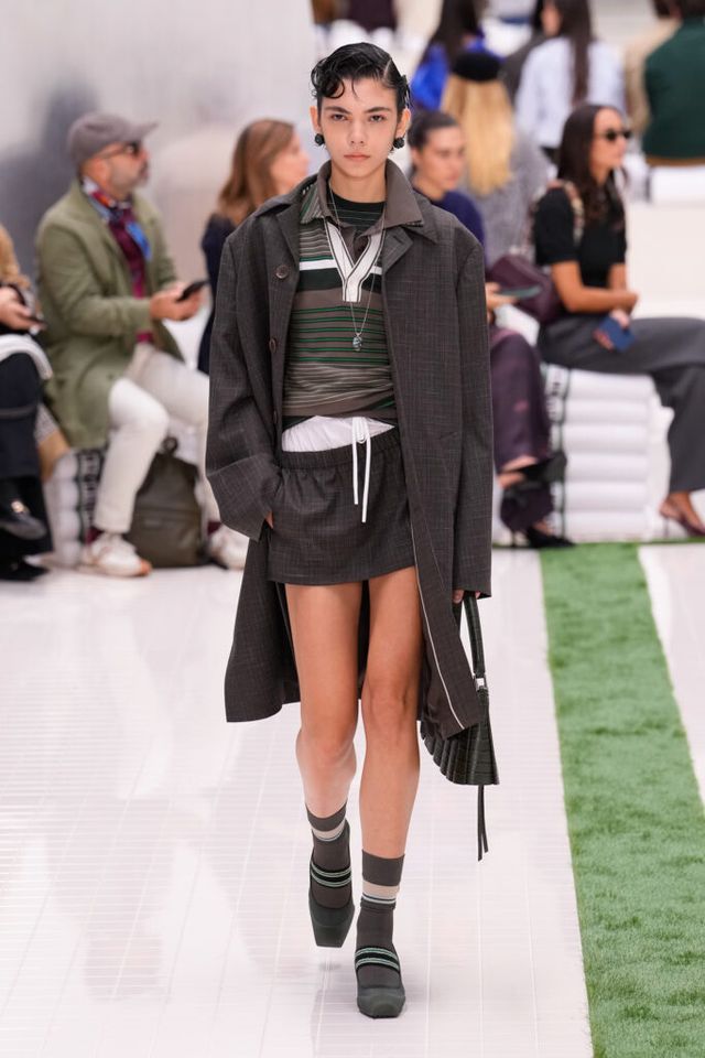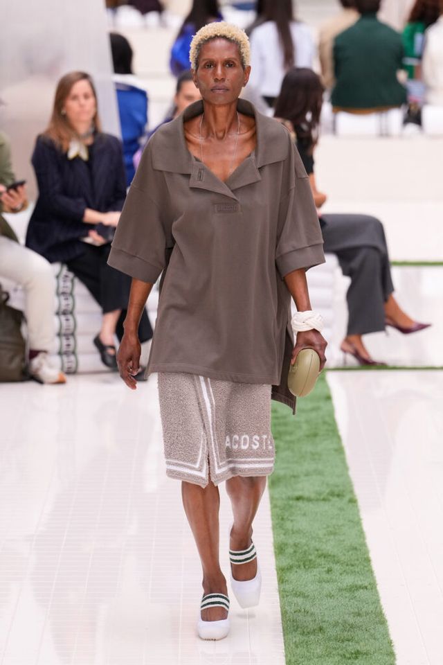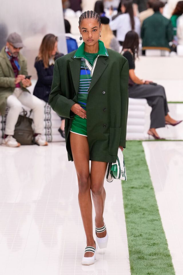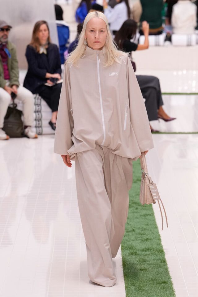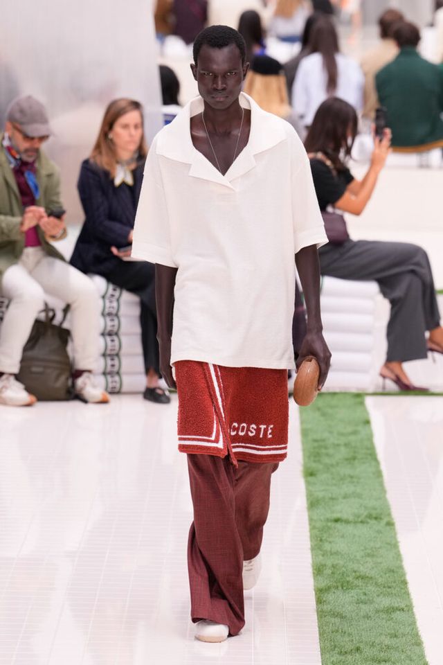 NOTE 펠라지아 콜로투로스는 라코스테의 스포츠 헤리티지를 다시 호출하며, 쇼장이 된 파리의 고등학교 리세 카르노(Lycée Carnot)를 로커룸으로 탈바꿈했다. 수증기 낀 유리, 샤워 커튼, 타일 바닥 등으로 연출한 무대는 경기가 끝난 직후의 긴장감을 머금고 있었고, 컬렉션은 그 순간을 구체적인 옷의 형태로 풀어냈다. 젖은 듯 광택이 도는 나일론과 가죽, 테리 스커트 등 기능성을 겸비한 소재의 룩은 스포츠웨어와 일상의 경계를 유연하게 넘나들었다. 특히 남녀 모델이 같은 아이템을 번갈아 입고 등장하는 방식은 옷의 실루엣과 기능이 성별에 구애받아서는 안된다는 그의 철학을 보여주는 대목이었다.