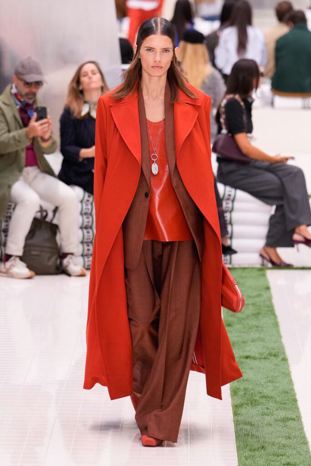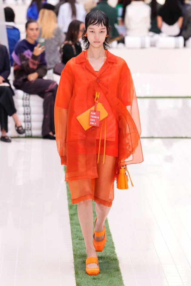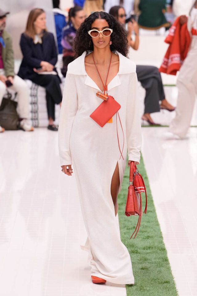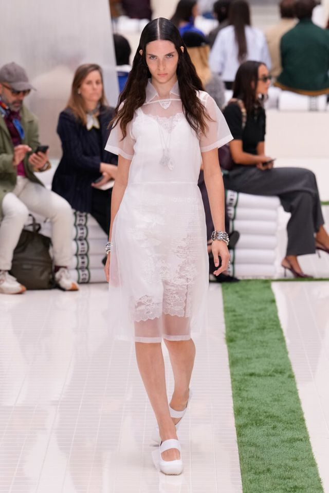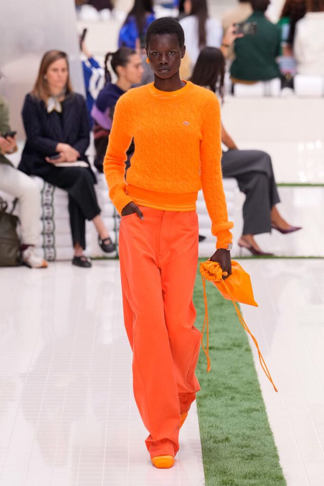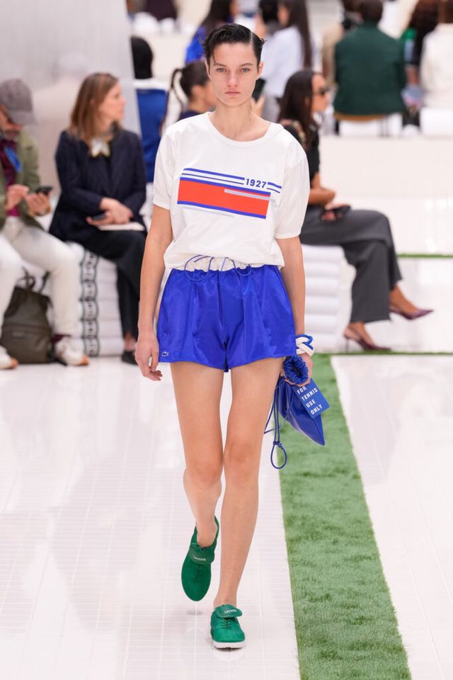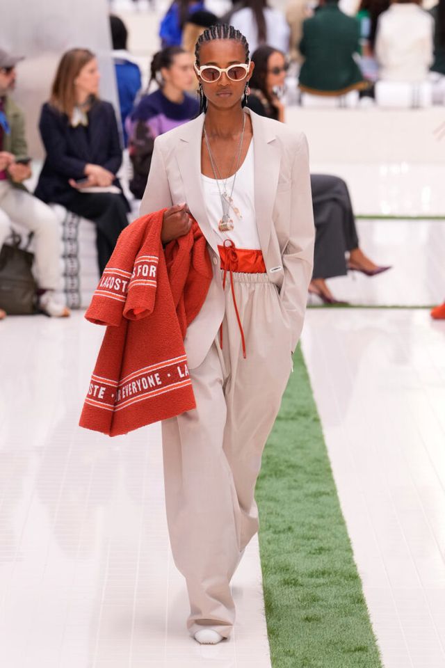 NOTE 펠라지아 콜로투로스는 라코스테의 스포츠 헤리티지를 다시 호출하며, 쇼장이 된 파리의 고등학교 리세 카르노(Lycée Carnot)를 로커룸으로 탈바꿈했다. 수증기 낀 유리, 샤워 커튼, 타일 바닥 등으로 연출한 무대는 경기가 끝난 직후의 긴장감을 머금고 있었고, 컬렉션은 그 순간을 구체적인 옷의 형태로 풀어냈다. 젖은 듯 광택이 도는 나일론과 가죽, 테리 스커트 등 기능성을 겸비한 소재의 룩은 스포츠웨어와 일상의 경계를 유연하게 넘나들었다. 특히 남녀 모델이 같은 아이템을 번갈아 입고 등장하는 방식은 옷의 실루엣과 기능이 성별에 구애받아서는 안된다는 그의 철학을 보여주는 대목이었다.