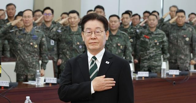 이재명 대통령이 27일 서울 용산구 국방부에서 열린 전군 주요 지휘관 회의에서 국민의례를 하고 있다. / 뉴스1