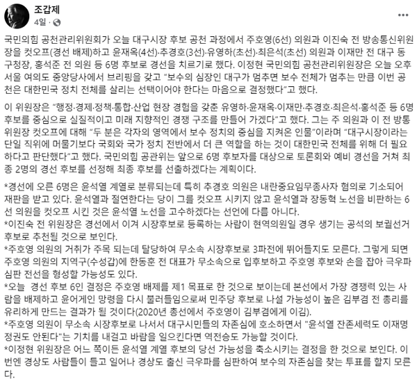 조 대표는 "경선에 오른 6명은 윤석열 계열로 분류되는데 특히 추경호 의원은 내란중요임무종사자 혐의로 기소되어 재판을 받고 있다"라고 전했다.