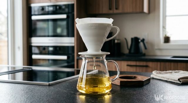 전분물을 이용해 큰 덩어리와 탄가루들을 제거했더라도 기름 속에는 여전히 눈에 잘 보이지 않는 미세한 이물질이 남아 있을 수 있다. 이를 완벽하게 제거하기 위해서는 2단계에 걸친 여과 과정이 필요하다. 우선, 첫 번째 단계로 촘촘한 채 망을 이용해 기름을 한 번 걸러준다. 전분 덩어리에서 떨어져 나온 부스러기나 미처 달라붙지 못한 큰 건더기들을 일차적으로 걸러내는 작업이다. 채 망 위에 키친타월을 한 장 깔고 기름을 부으면 훨씬 더 깔끔하게 걸러지지만, 더 확실한 방법을 원한다면 커피 필터를 사용하는 것이 좋다.
