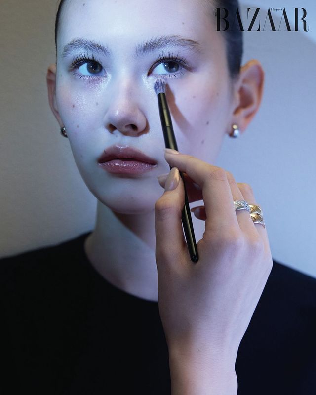 화이트 골드 이어링, 중지에 착용한 다이아몬드 세팅의 화이트 골드 스몰 링, 약지에 착용한 옐로 골드 스몰 링, 레이어드한 다이아몬드 세팅의 베이지 골드 스몰 링은 모두 ‘코코 크러쉬’ 컬렉션 Chanel Fine Jewelry.