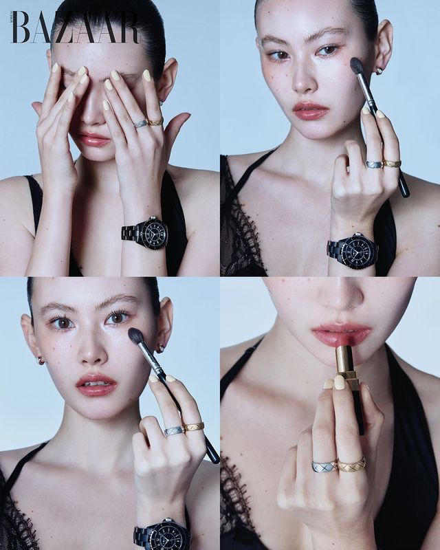 베이지 골드 초커, 중지에 착용한 다이아몬드 세팅의 화이트 골드 스몰 링, 약지에 착용한 옐로 골드 스몰 링, 레이어드한 다이아몬드 세팅의 베이지 골드 스몰 링은 모두 ‘코코 크러쉬’ 컬렉션 Chanel Fine Jewelry. 블랙 래커 다이얼의 세라믹·스틸 케이스 ‘J12 칼리버 12.2 33mm’ 워치는 Chanel Watches.