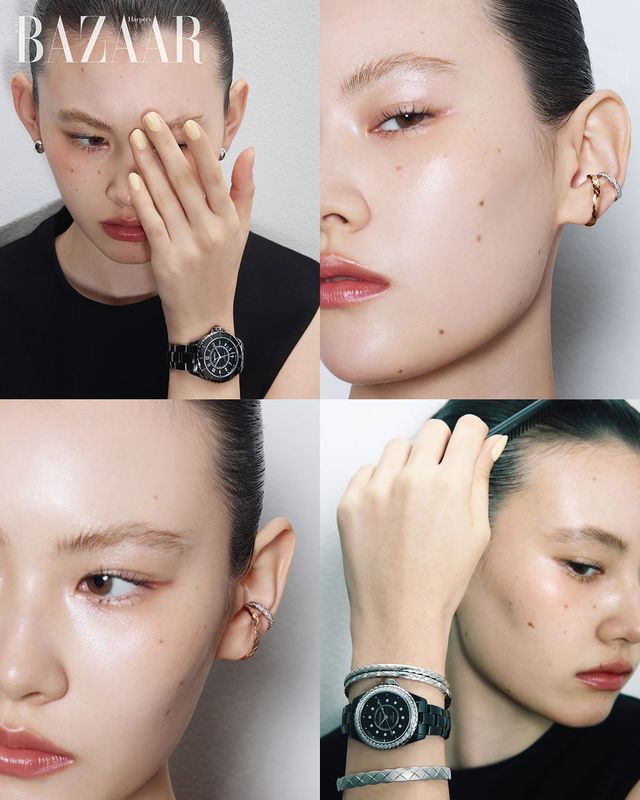 다이아몬드를 세팅한 베이지 골드 이어링, 검지에 착용한 옐로 골드 스몰 링, 중지에 착용한 화이트 골드 스몰 링은 모두 ‘코코 크러쉬’ 컬렉션 Chanel Fine Jewelry. 블랙 래커 다이얼의 세라믹·스틸 케이스 ‘J12 칼리버 12.1 38mm’ 워치는 Chanel Watches.