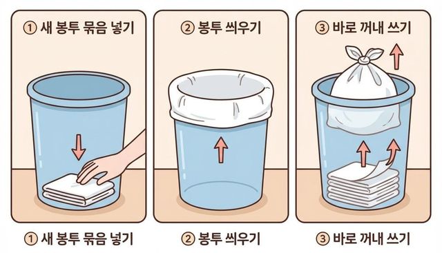 방법은 의외로 투박하다. 새 봉투 뭉치를 가볍게 접어 현재 사용 중인 휴지통 맨 바닥에 깔아두는 것이 전부다. 그 위로 봉투 한 장을 씌워 평소처럼 쓰레기를 담는다. 쓰레기가 가득 차 봉투를 수거하는 즉시, 바닥 밑에 대기 중이던 다음 봉투를 바로 끌어올려 끼우면 된다. 봉투를 찾기 위해 서랍을 뒤적이거나 주방과 거실을 오가는 불필요한 동선을 원천 차단한, 이른바 '제로 동선' 솔루션이다.