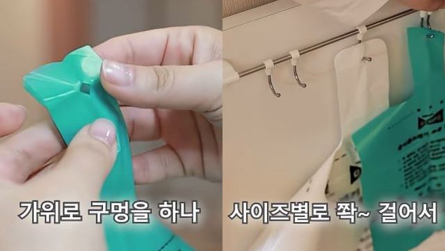 종량제봉투에 가위로 구멍을 뚫은 후 사이즈별로 고리에 걸어둔 모습. / 유튜브 '꽁주부'