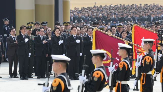 이재명 대통령과 김혜경 여사가 27일 국립대전현충원에서 열린 제11회 서해수호의 날 기념식에서 국민의례를 하고 있다. / 뉴스1