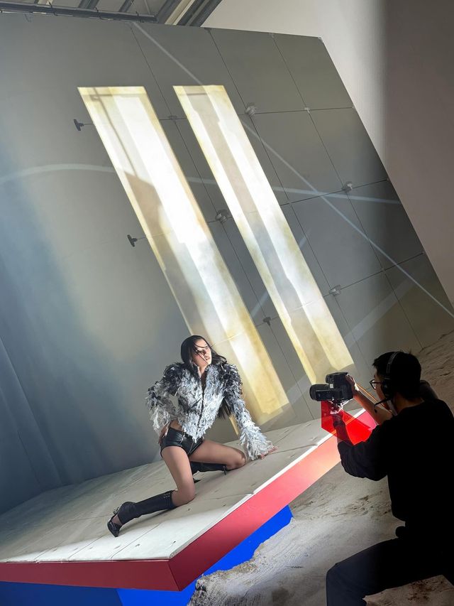 가장 먼저 눈길을 끄는 것은 지수가 직접 ‘까마귀 옷’이라 지칭한 상의다. 흑색과 백색의 깃털 소재가 거칠게 레이어드된 이 의상은 마치 날개를 형상화한 듯한 디자인으로 지수 특유의 차분하면서도 강렬한 눈빛과 어우러져 신비로운 분위기를 자아낸다.
