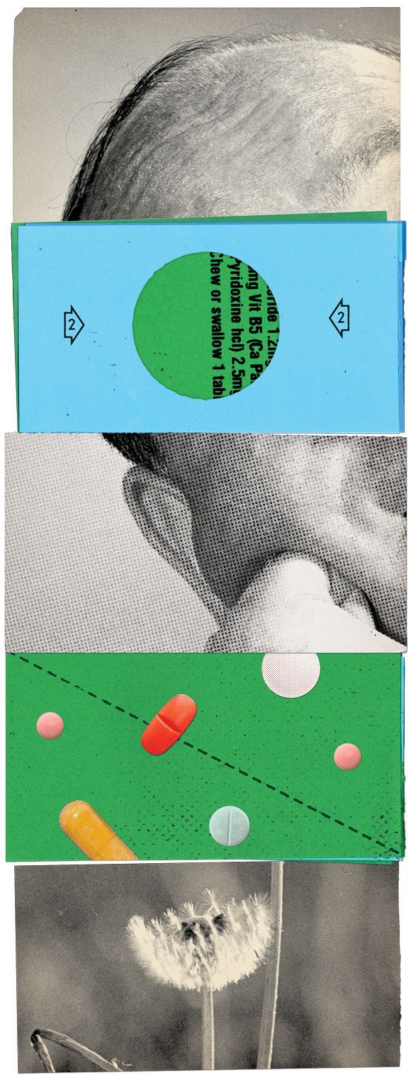 “오해하지 마세요. 20대 때처럼 풍성해졌다는 뜻은 아니에요. 다만 더 가늘어지지는 않고 있다는 거죠.” 탈모가 일찍 찾아왔고, 두 약을 알약 형태로 먹는 게 편하다고 한다. “저는 약 때문에 동일한 기분을 유지할 수 있었던 거죠. 제가 젊다고 느끼지는 않지만, 그렇다고 제가 늙은이로 변하고 있다는 느낌도 없거든요.”