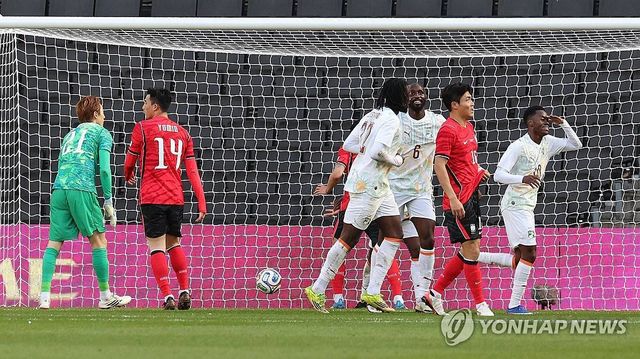 하지만 이번 평가전에서 처음 시행된 3분간의 하이드레이션 브레이크 이후 분위기가 달라졌다. 개인 능력을 앞세운 코트디부아르가 점차 주도권을 가져갔고, 한국은 전반 35분 먼저 실점했다. 마르시알 고도의 낮은 크로스를 에반 게상이 문전에서 오른발로 마무리했다. 이 장면에서는 조유민이 고도와의 경합에서 밀린 것이 뼈아팠다.