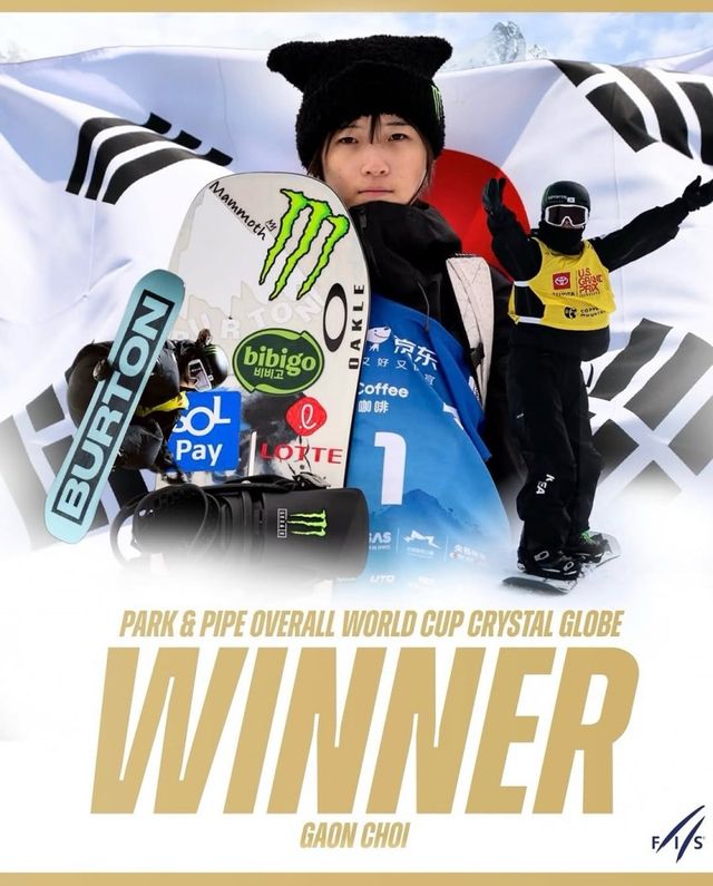 최가온은 이번 시즌 월드컵 하프파이프에서만 3승을 거두며 여자 하프파이프 크리스털 글로브를 차지했고, 파크 앤드 파이프 순위에서도 여자부 1위에 올랐다.
