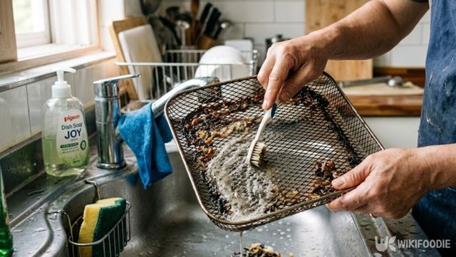 에어프라이어 망은 기름이 튀고 열을 받아 굳으면서 망 구멍 사이에 눌어붙는다. 행주나 스펀지로 겉면을 닦아도 구멍 안쪽까지 파고들지 않아 때가 남는다. 짧게 자른 칫솔로 구멍 사이를 문지르면 탄성 있는 솔 끝이 안쪽까지 밀고 들어가 떼어낸다.
