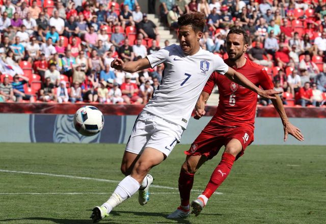 2016년 6월 한국과 체코의 축구국가대표팀 친선경기에서 손흥민이 상대편 수비수를 따돌린 채 돌파를 시도하고 있다. / 연합뉴스