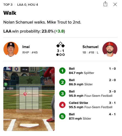 이마이는 1회 초 MLB 대표 타자 마이크 트라웃을 3구 삼진 처리하며 기세를 높였다. 포심 패스트볼(직구)만 3개를 연속 던지는 '패기'를 보여줬다. 하지만 앞서 상대한 잭 네토, 1사 뒤 놀란 샤누엘에게는 영점이 크게 흔들리며 볼넷을 내줬다.