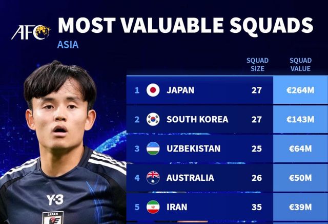 이어 도안 리츠(아인라흐트 프랑크푸르트), 골키퍼 스즈키 자이온(파르마)이 2000만유로(약 347억원), 이토 히로키(바이에른 뮌헨)와 스즈키 유토(프라이부르크)가 1800만유로(약 313억원)로 뒤를 이었다.