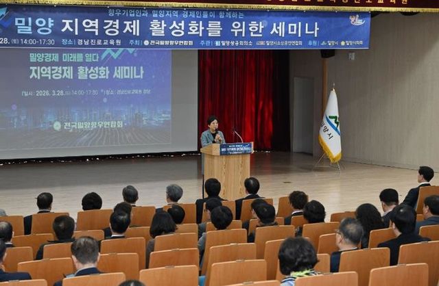 [파이낸셜경제=김영란 기자] 경남 밀양시는 지난 28일 경남교육청 진로교육원 강당에서 전국밀양향우연합회 주최로 ‘지역경제 활성화 세미나’가 열렸다고 밝혔다.