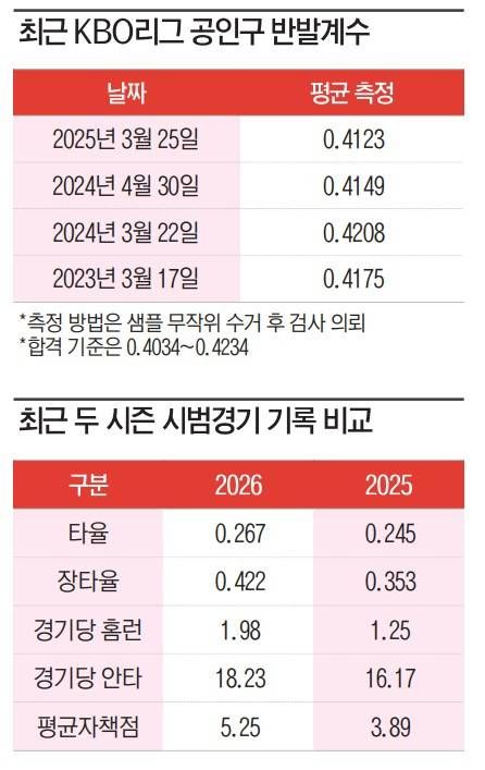 개막 첫 2연전에서는 '타고투저' 양상이 두드러졌다. 리그 평균자책점은 6.00까지 치솟은 반면, 리그 타율은 0.280으로 높게 나타났다. KT 위즈와 한화 이글스의 팀 타율은 무려 0.382, 0.360이었다. 경기당 평균 홈런은 1.65개에서 2.4개로 늘었다. 공인구 반발계수 상향을 예상한 시선이 많았으나 결과는 달랐다. 평균 반발계수 0.4093은 2025년 3월(0.4123), 2024년 4월(0.4149), 2024년 3월(0.4208), 2023년 3월(0.4175)과 비교해도 현저히 낮은 수치. KBO는 투수의 구속 저하 등을 장타가 늘어난 배경으로 지목하고 있다. 실제로 KBO는 이번 시범경기 평균 구속이 전년 대비 약 3㎞/h 낮아진 것으로 파악한다.
